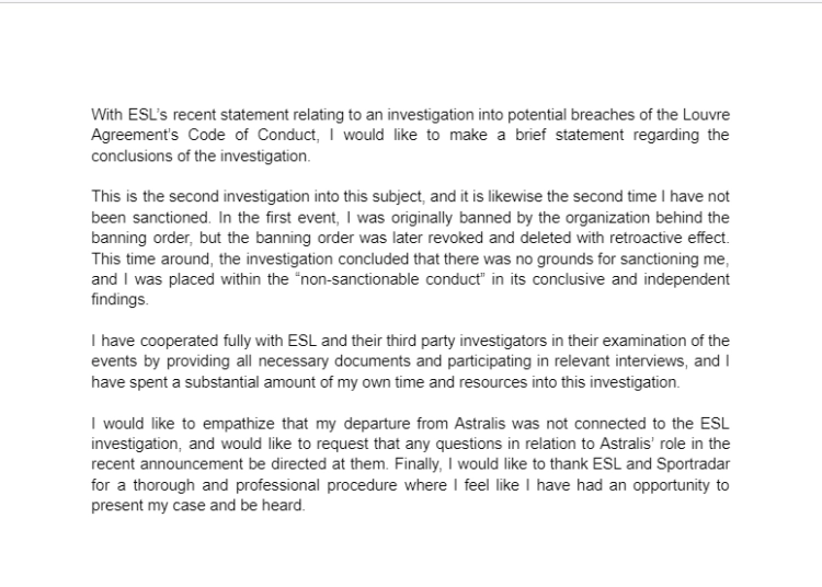 ESL Pro League Commissioner Alex Inglot said in a statement that Astralis fully cooperated during the investigation and that the organization is satisfied with its findings:
