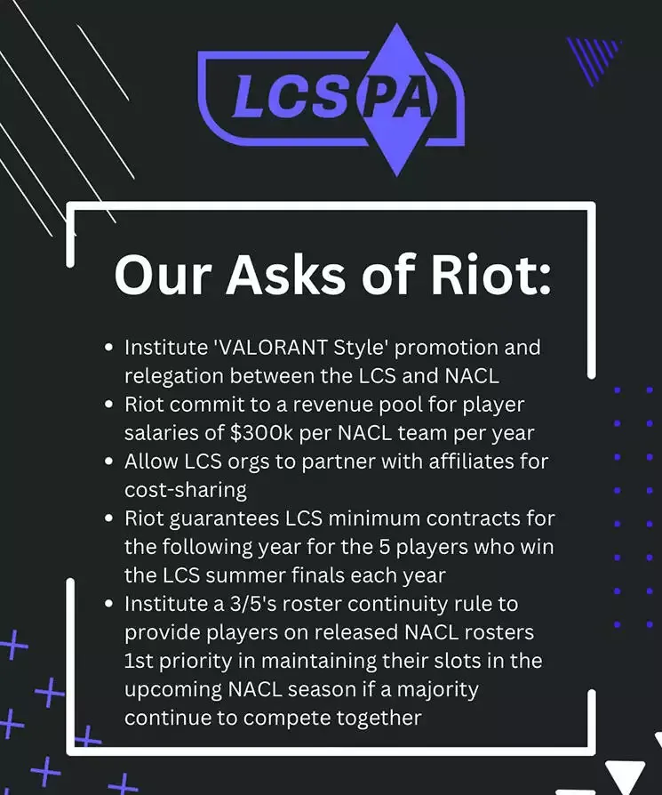 In addition to announcing the decision by LCS players to walk out, the NALCSPA released a list of demands for Riot (you can see those demands in our previous reporting, we’re not going to rehash them here).