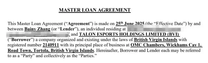 According to text messages and loan documents reviewed by The Esports Advocate, Sean Zhang reached out to Bainy on June 25 seeking a $1 million personal loan on behalf of Talon Esports. The funds were intended to cover player payments and short-term capital expenses while Talon awaited promised investment funding.