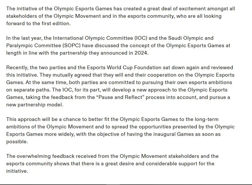The International Olympic Committee (IOC) announced Thursday that it has mutually agreed with the Saudi Arabian government to cancel the 12-year deal to host and operate the Esports Olympic Games. The initial deal was signed in July 2024 by then IOC President Thomas Bach and the National Olympic Committee (NOC) of Saudi Arabia (the Saudi Arabian government).