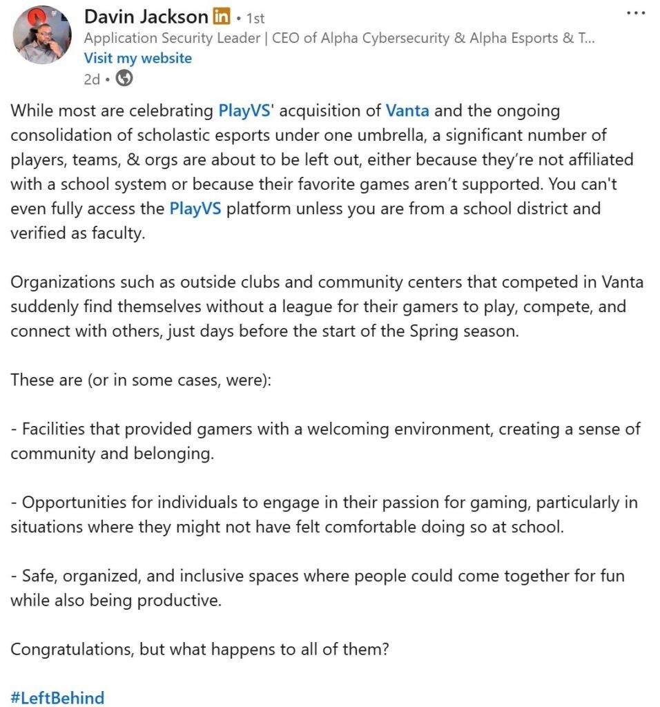 While some are celebrating this acquisition and view it as another puzzle piece in continuing to make scholastic, collegiate, and grassroots esports a more sustainable space, others are concerned that it takes options off the table for some groups who used to rely on Vanta’s suite of products and services to support their efforts. For example, Davin Jackson, CEO of Atlanta-based Alpha Esports & Technology, pointed out how this new deal affects him and his community directly on social media: