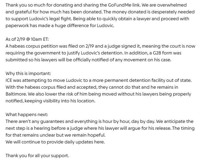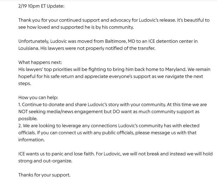 An additional update on Feb. 19, at 10 p.m. EST, claims that Mbock was moved from Baltimore to a detention center in Louisiana.